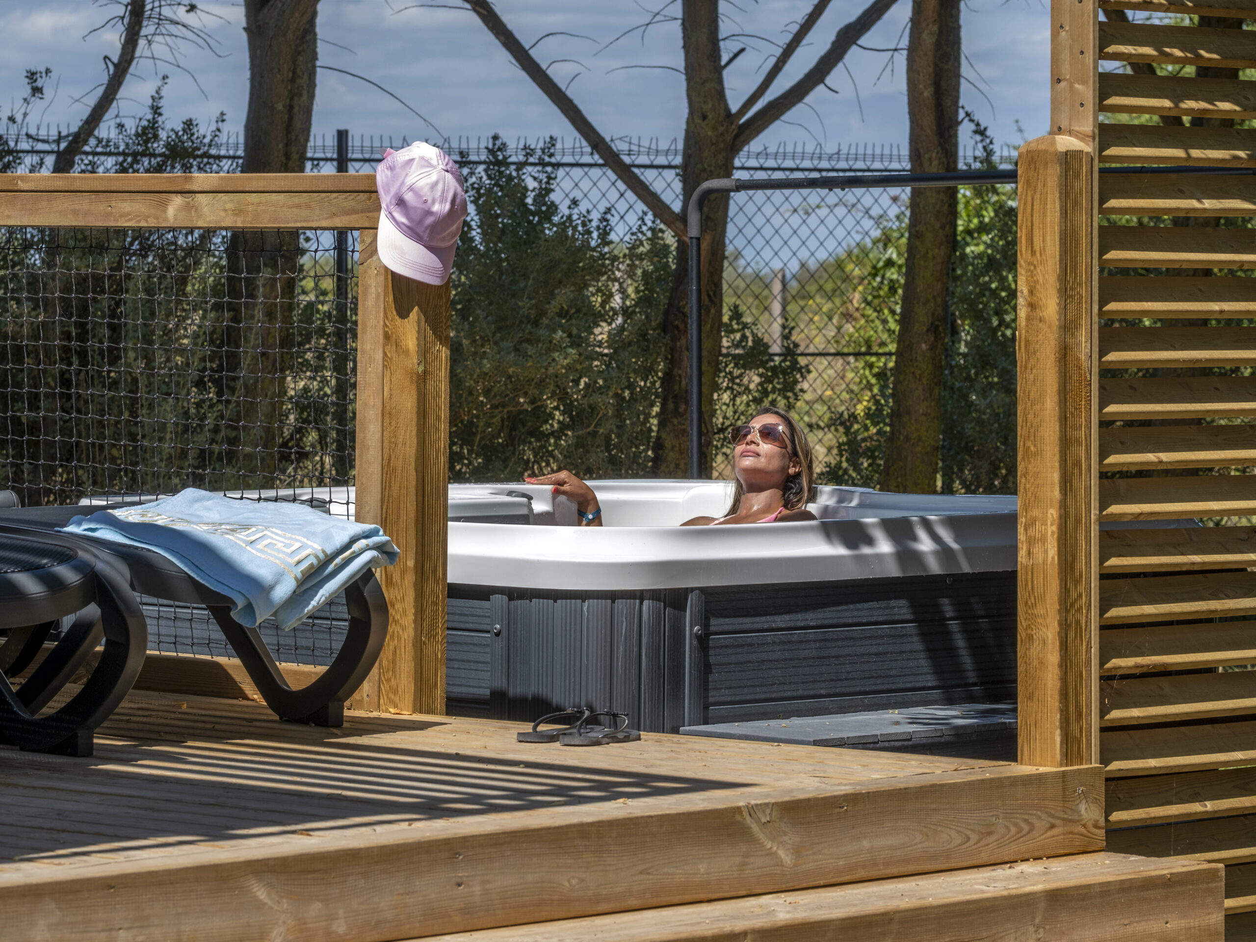 Discover our premium 29 m² mobile home with top-quality amenities for 4 people. New in 2025: the Premium Plus package includes a mobile home in a pedestrian area, with beds made upon arrival and end-of-stay cleaning. The Homeflower promises unforgettable, home-like vacations! Enjoy air conditioning, blackout blinds for a great night’s sleep, mosquito nets in both bedrooms (2 single beds 80×190 cm, 1 double bed 160×200 cm), with linens and towels included. A private semi-covered terrace of over 20 m², modern decor, TV, and a private jacuzzi complete your stay.